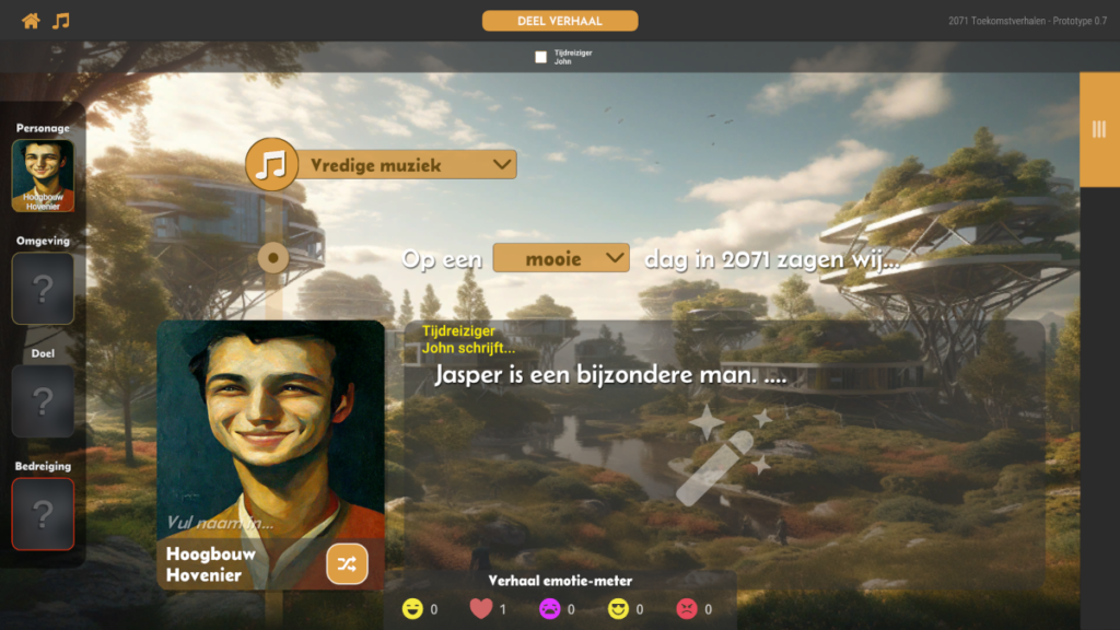 Toekomstverhalen is een serious game waarin spelers zich verplaatsen naar het jaar 2071 en samen verhalen bouwen over mogelijke toekomsten. Door verbeelding en storytelling te gebruiken als spelmechaniek ontstaan verrassende, out-of-the-box ideeën over hoe we met toekomstige duurzaamheidsvraagstukken om kunnen gaan.